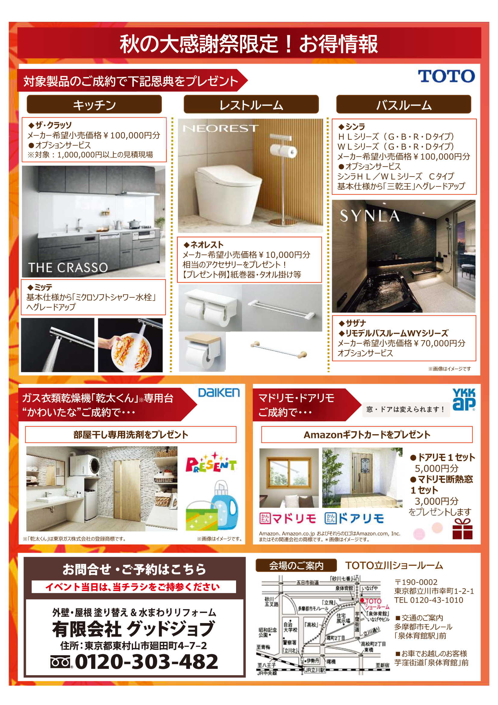 日頃のご愛顧に感謝を込めて、TOTO立川ショールームにて「秋の大感謝祭」を開催いたします!